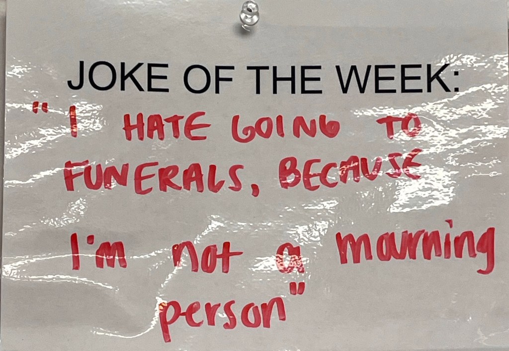 “I hate going to funerals because I’m not a mourning person.” – the joke of the week as found on the wall of a medical examiner’s office.